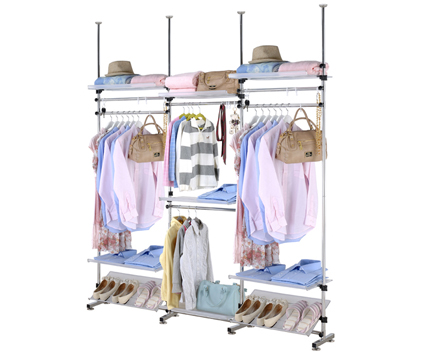 3. 附9個活動層板及9支吊桿,可依物品的大小隨心調整高度,也可平行無限擴充,充分利用空間。